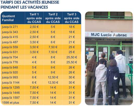 Pour chaque période de vacances, un programme est proposé aux jeunes avec des activités (manuelles, sportives…) et des sorties. Les programmes sont disponibles et les inscriptions sont ouvertes trois semaines avant chaque période de vacances.